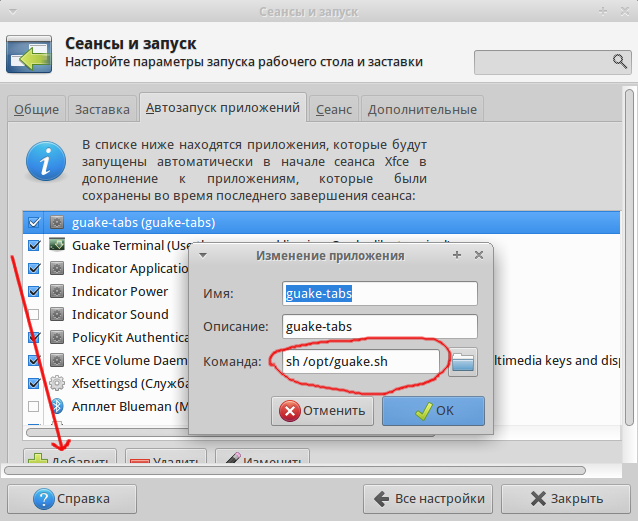 Для этого в Диспетчере настроек выбираем Сеансы и запуск, вкладка Автозапуск приложений. Добавить новую команду /opt/guake.sh